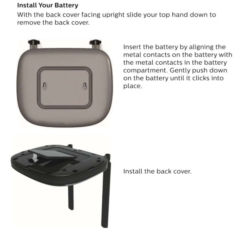 With the back cover facing upright, slide the casing in a downward motion to remove the back cover. Once removed, insert the battery by aligning the metal contacts on the battery with the metal contacts in the battery compartment. Gently push down the battery until it clicks into place. Once in place, install the back cover. See the below diagram from page 6 of the user manual.