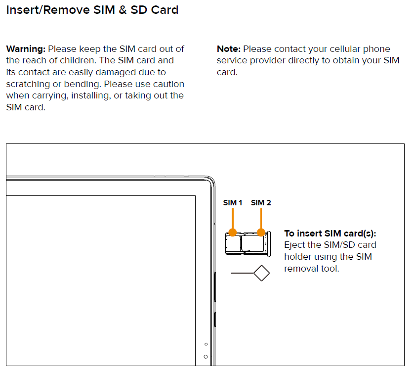 Installing the SIM Card Follow the instructions below to install the SIM card: 1. Remove the SIM card from the outer card, being careful not to touch the gold contacts. Insert the SIM card into card slot in the correct position: Open the SIM Card ...