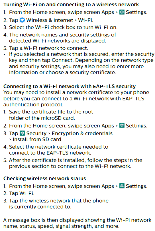 Wi-Fi connection 1. To Access the internet through a Wi-Fi network, go to the Settings > Network & Internet > Wi-Fi. 2. Tap on/off to activate Wi-Fi capability, a list of available networks will display. 3. Select the network that you want to ...